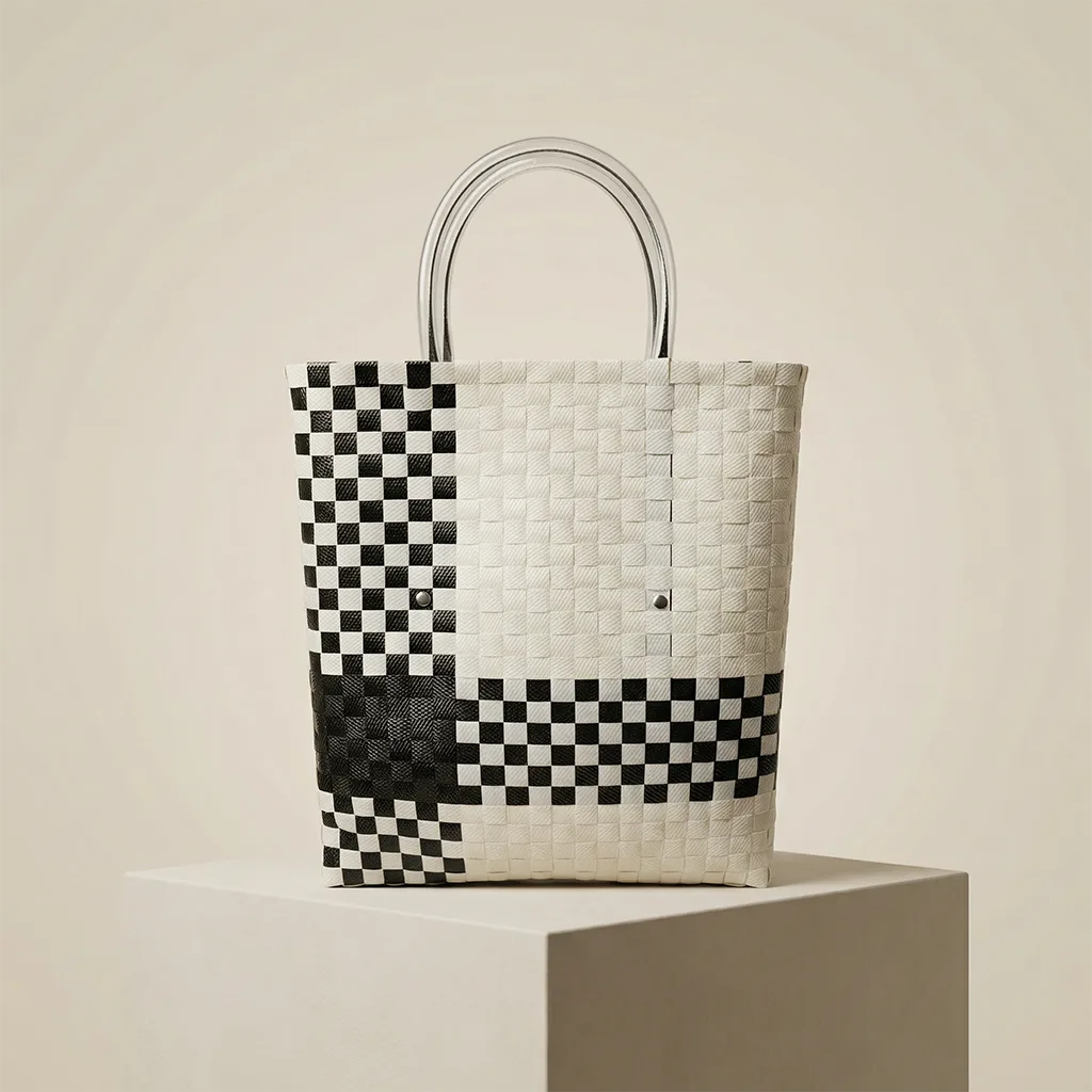 cesto elaborado en fibras de pvc reciclado. 32 x 29 x 14 cms. aprox. trama en marfil con negro. remache en la fila 11, etiqueta de metacrilato azul turquesa.